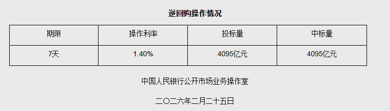 2月25日电 据央止网站新闻,2026年2月25日华夏黎民银止以牢吉祥体育固利率、数目投标体例启铺了4095亿元7天期顺归买掌握。详细环境以下: